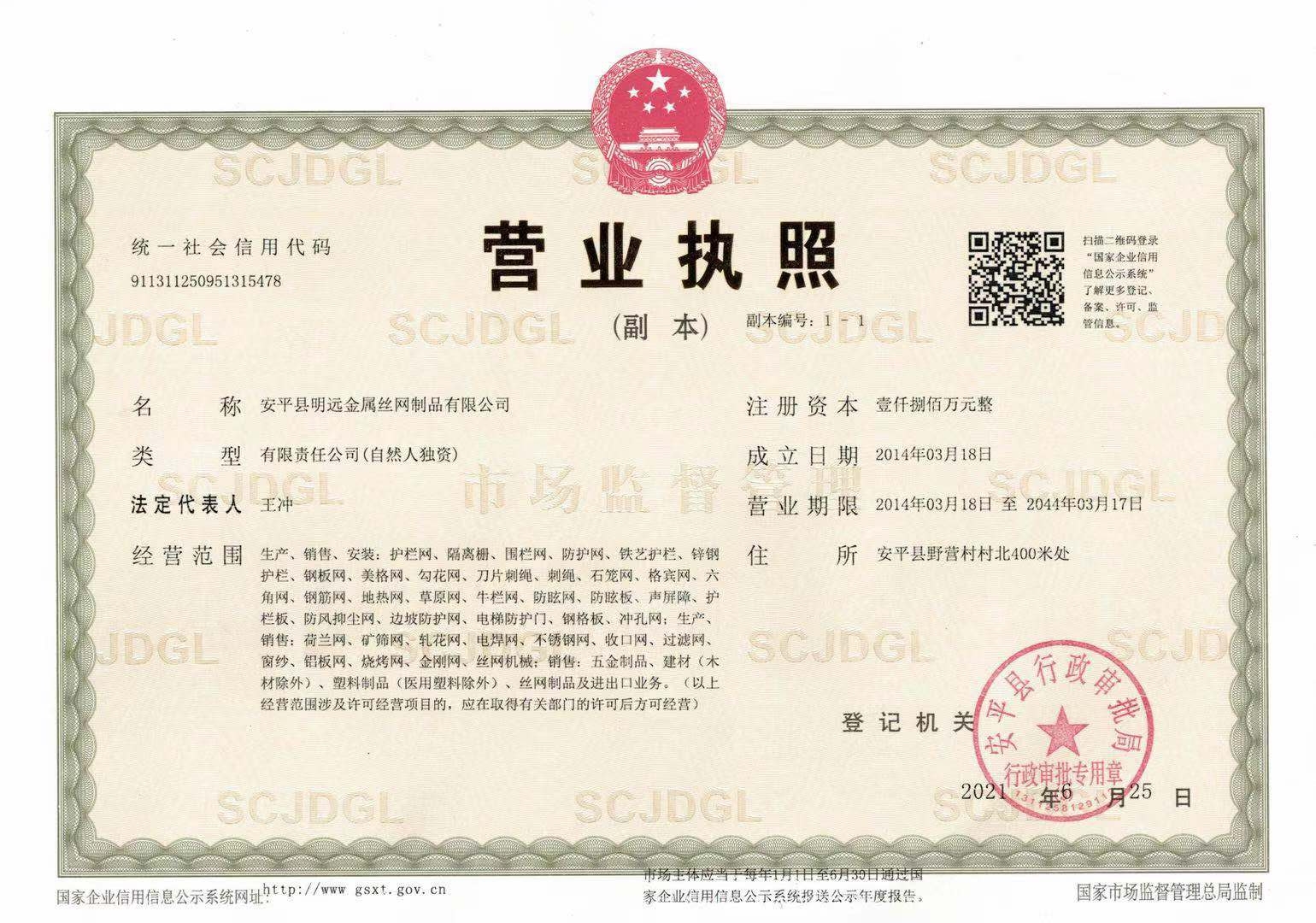 安平縣明遠(yuǎn)金屬絲網(wǎng)制品有限公司 -  座落于絲網(wǎng)產(chǎn)業(yè)基地河北安平,二十年絲網(wǎng)制作經(jīng)驗(yàn),是一家從拔絲、焊接、打砂、折彎、鍍鋅、噴塑、浸塑、為成品,生產(chǎn)研發(fā)安裝為一體的交通工程護(hù)欄網(wǎng)、光伏景區(qū)圍欄網(wǎng)專業(yè)型企業(yè)。明遠(yuǎn)公司擁有先進(jìn)的生產(chǎn)設(shè)備,全自動(dòng)浸塑、噴塑、鍍鋅生產(chǎn)線,電腦焊網(wǎng)機(jī)組,聯(lián)合壓力機(jī),數(shù)控折彎?rùn)C(jī),槍尖沖孔機(jī)等多臺(tái)輔助設(shè)備,具有大批量生產(chǎn)能力。